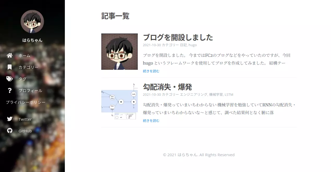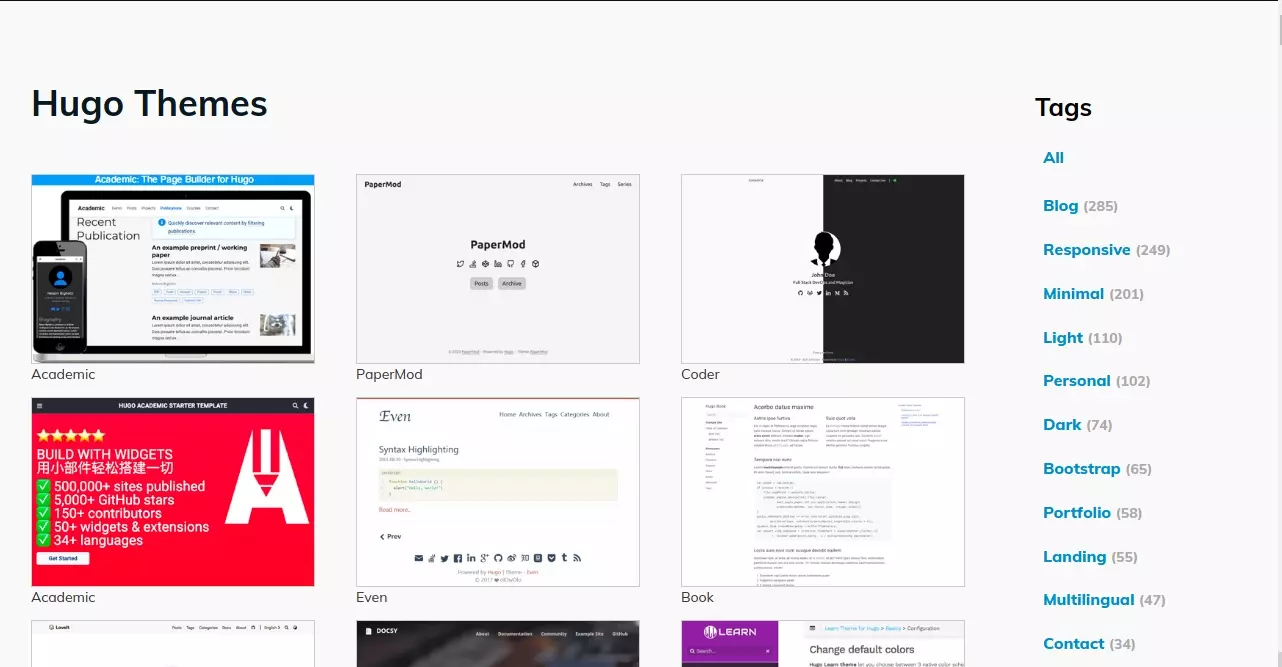 使用できるテーマも数多く揃えられており、柔軟性もあるとのことだったので今回はhugoを使って実際にブログを作成してみました。 先に触ってみた感想なのですが、下記画像のように本当に多くのテーマが用意されており選ぶだけで楽しかったです。また、テーマのカスタマイズも簡単に行なえ自分好みにできるので結構体験良かったです。