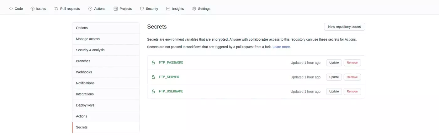 続いて、「GitHub Secrets」にFTPの接続情報を設定します。