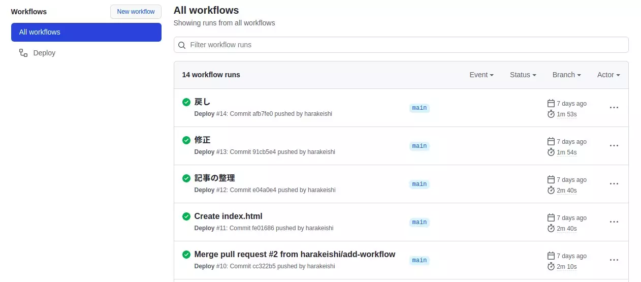 結果や状態を見たい場合は、「Actions」を開くと以下のように表示されると思います。