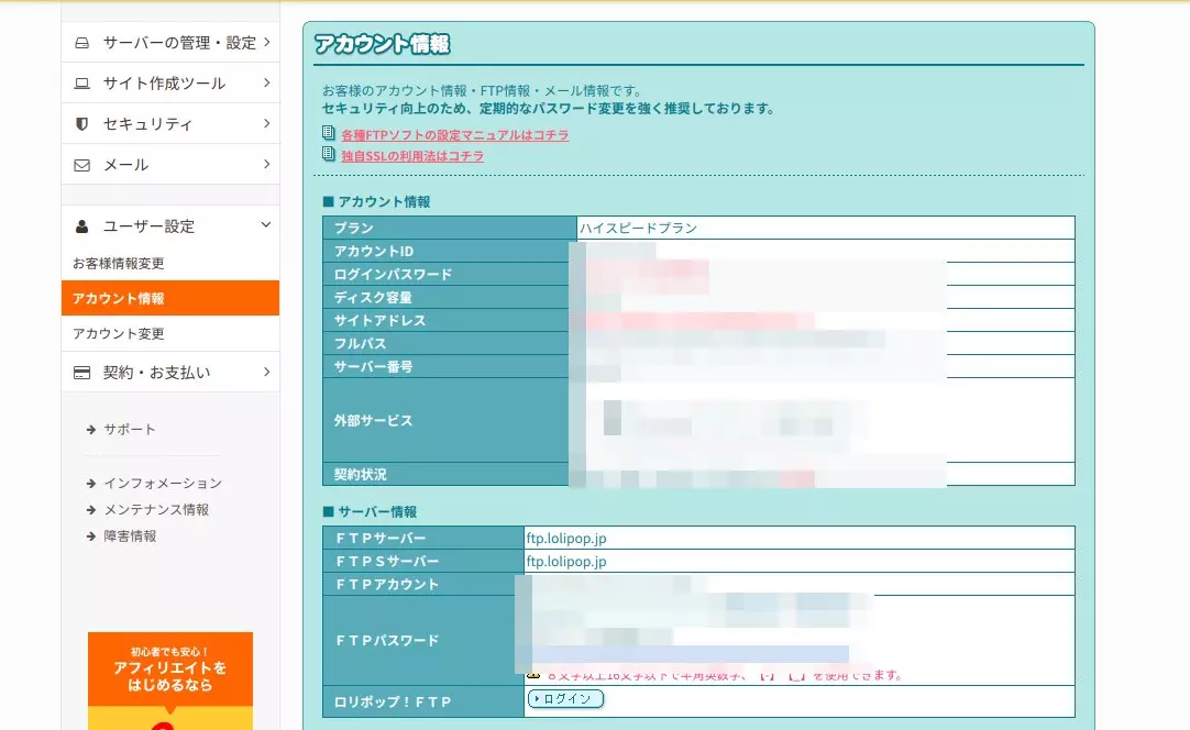 「サーバー情報」にある「FTPサーバー」、「FTPアカウント」、「FTPパスワード」をメモってください。