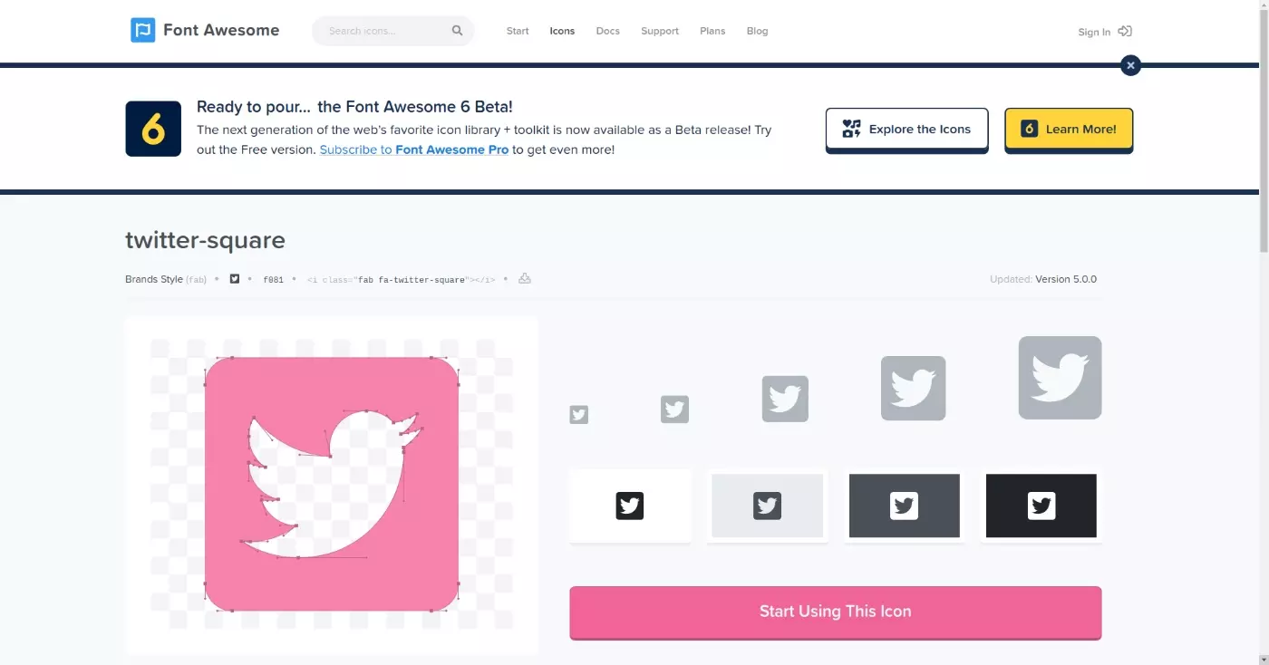例えば、下記のような四角い枠に囲まれたTwitterアイコンに変えたい場合は、twitter-squareというのがアイコン名なのでfab fa-twitter-squareと置き換えましょう。