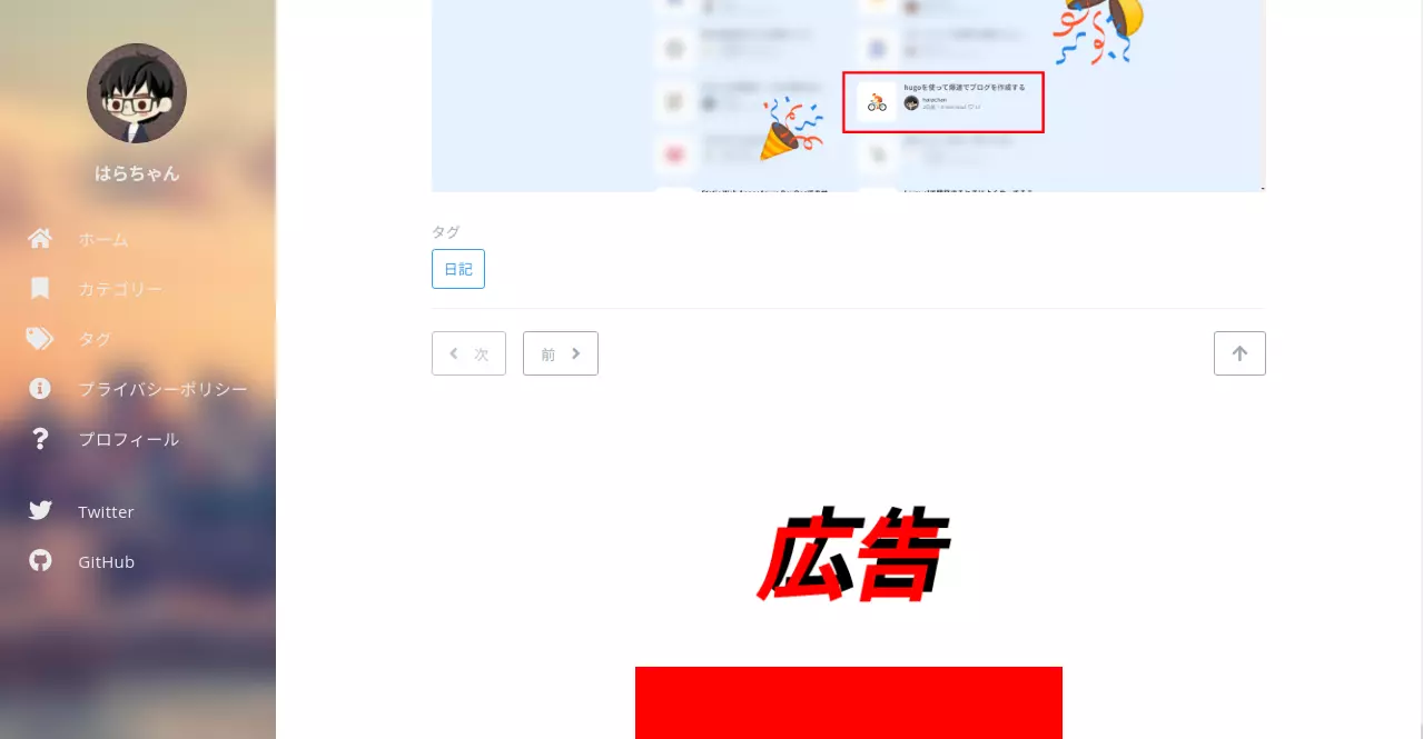 これで確認すると以下のように、ページネーションや日付、タグ、広告が表示されなくなりましたね!