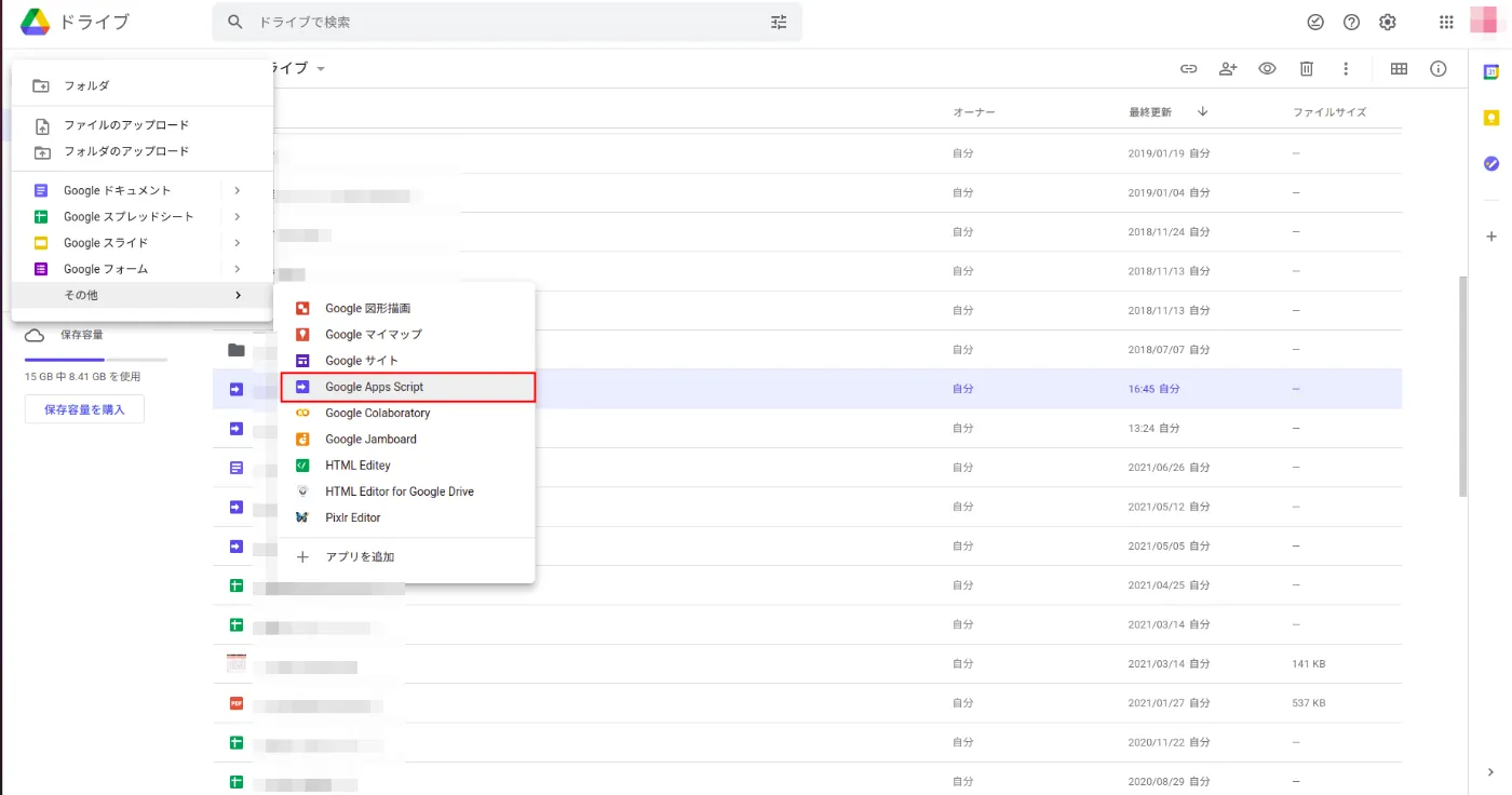 google driveを開き下記の場所からgasの新しいプロジェクトを作成します。