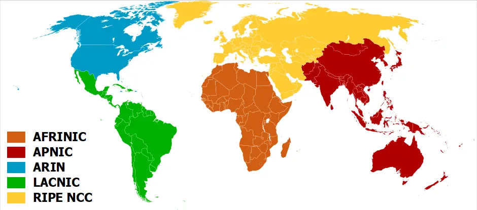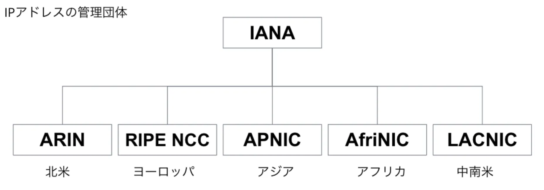 IPの管理は、ICANN(正確にはIANA)が行っています。しかし、1団体で世界中を管理するのは大変です。 なので、下記のように各地域ごと管理する団体に権限を委譲しています。